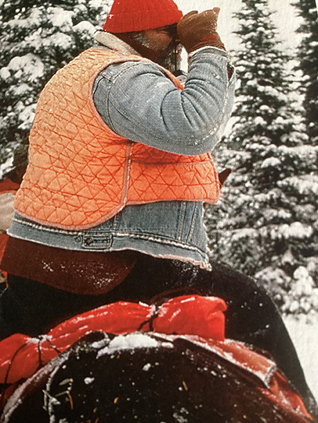 After several hours of riding in swirling winds, Pat was intent on riding to the rim of a basin that had produced for him in the past. The wind picked up as we rode higher and higher. On a game trail in the timber the wind calmed. As we rode out of the trees we approached a powder snowdrift towering four feet high. Pat led his horse through it first. The animal bucked and plowed through the drift, creating a cloud of churning snow that instantly reduced visibility to zero. The rest of us followed, and nature’s fury immediately punched the horses. Gale-force winds gusted so powerfully I could barely keep my eyes open or take a breath. All I could see was a frenzied scene of panicky horses and snow-covered humans. Pat was yelling, but we couldn’t hear him.